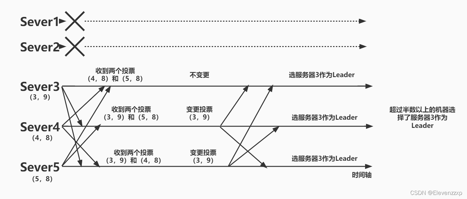 - 对于Sever4:Sever4接收到了Sever3的投票(3,9)和Sever5的投票(5,8),然后进过对比,发现(3,9)这个投票的ZXID大于自己,因此需要变更投票为(3,9),然后变更后的投票发送给Sever3和Sever5两台机器。