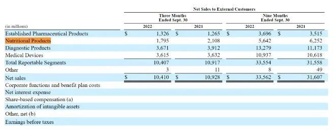 雅培三季报显示,2022年前三季度,雅培药品业务营收为36.96亿美元,营养业务营收为56.42亿美元;诊断业务营收132.79亿美元;医疗器械销售额为109.37亿美元。营养业务的占比仅高于药品业务。