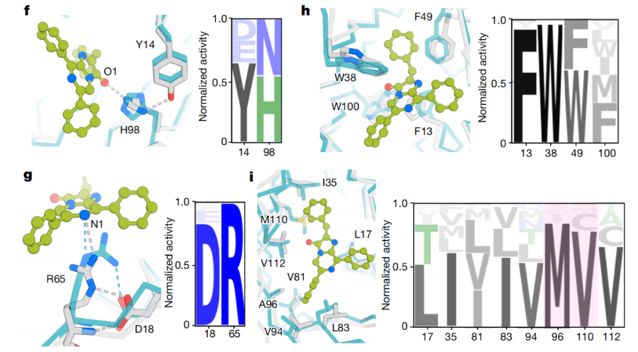 一方面,这也让我们看到了深度学习在人工酶方面的力量。除了LuxSit外,研究团队还在继续设计其他荧光素酶,识别另一种合成荧光素底物——2-脱氧腔肠素或h-CTZ。因为h-CTZ的分子形状不同于DTZ,为了创造活性位点,研究人员安装了组氨酸和精氨酸侧链的精确排列。这些活性位点特征是根据在第一轮荧光素酶设计中观察到的成功案例来模拟的。