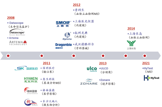2008年,迈瑞收购了全球最老牌的监护品牌Datascope,成为了全球监护领域第三大制造商;此后公司又陆续并购了深科医疗、苏州惠生、Zonare、Ulco等多家海内外一流企业。