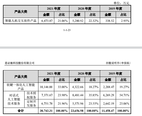 招股书显示,该三大业务在2021年的营收和占比分别为:智能人机交互软件产品0.65亿元, 占比21.06%;软硬一体化人工智能产品1.02亿元,占比33.00%;对话式人工智能技术服务中技术授权服务0.74亿元,占比23.98%;定制开发服务为0.68亿元,占比21.96%。由此可见,营收占比最高的软硬一体化人工智能产品是思必驰最大的业绩贡献者,也是唯一一项占比逐年增长的业务。报告期内,从2019年占比不到20%逐年增长至2021年的33%。