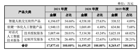 从营收构成看,思必驰主营业务分三大板块,分别是智能人机交互软件产品、软硬一体化人工智能产品和对话式人工智能技术服务。