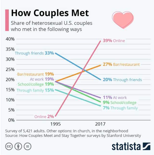 情况确实如此,斯坦福大学的一项调查显示,1995-2017年,在互联网上认识伴侣的人数占比从2%上升到39%。