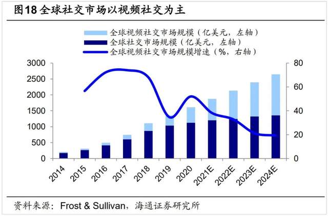 疫情更刺激了这一趋势,据Frost & Sullivan的预测,2024年全球社交市场规模将达到2644亿美元。其中视频社交将成为最主流的线上社交形式,预计2024年将达到1287亿美元。