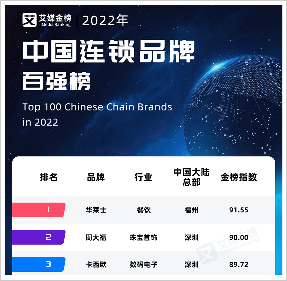 艾媒金榜最新发布的《2022年中国连锁品牌百强榜》,横跨17个行业,对企业综合实力要求较高。华莱士在榜单中力压周大福、星巴克等知名消费品牌,位列第一。