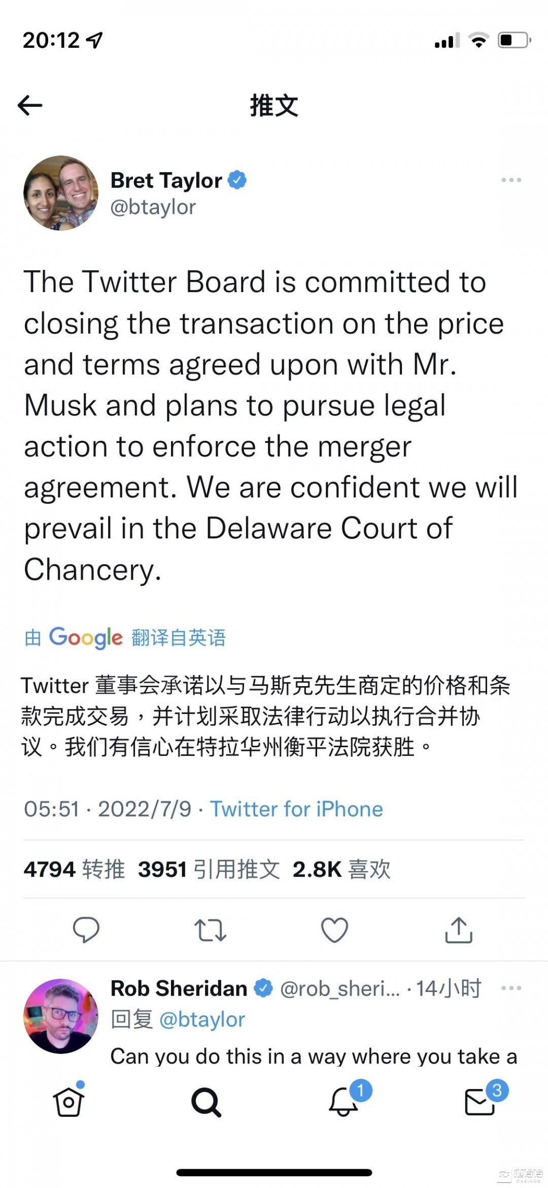 推特公司董事长泰勒(Bret Taylor)发布推文称,“推特董事会致力于按照和马斯克先生达成的价格和条款来执行合并协议,我们有信心可以在特拉华州法院取得胜利。”