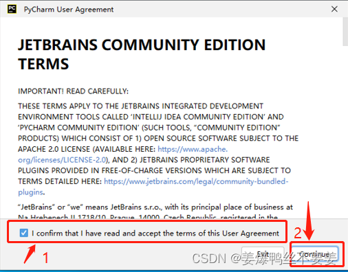 Anaconda和Pycharm软件都安装成功后,开始进行配置,打开pycharm,第一次打开会出现以下界面,勾选** I confirm,然后点击 Continue,然后选择 don't send **即可