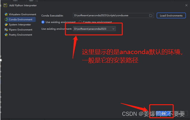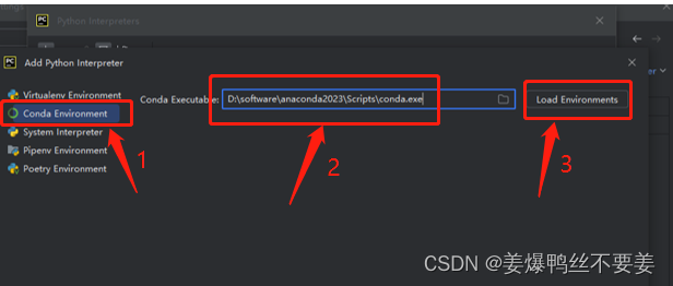 然后选择conda environment,并选择anaconda安装路径中找到scripts中的conda.exe,并点击Load Environment