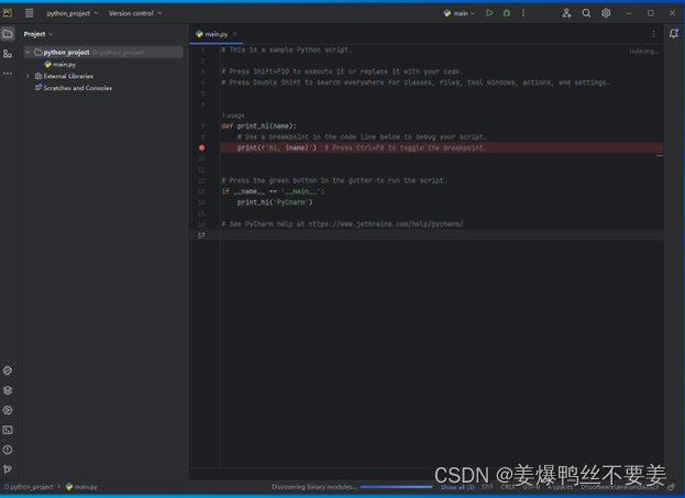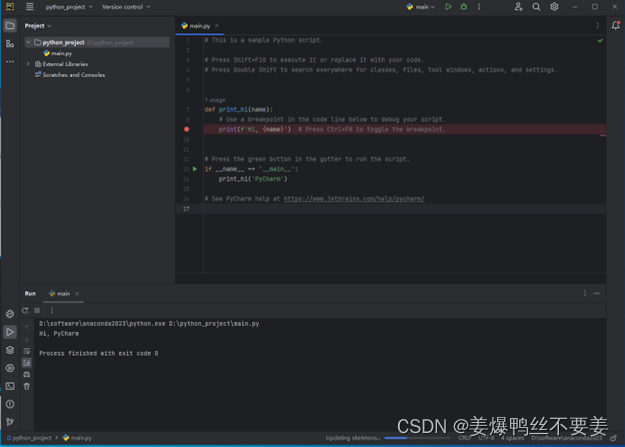 然后等待几分钟,直到可以运行程序即可,说明Anaconda和Pycharm的配置就完成啦!