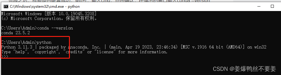 完成之后,检验是否配置成功,win+r,输入cmd,点击确认,在弹出的窗口输入conda --version并回车,出现版本号(如下图所示)