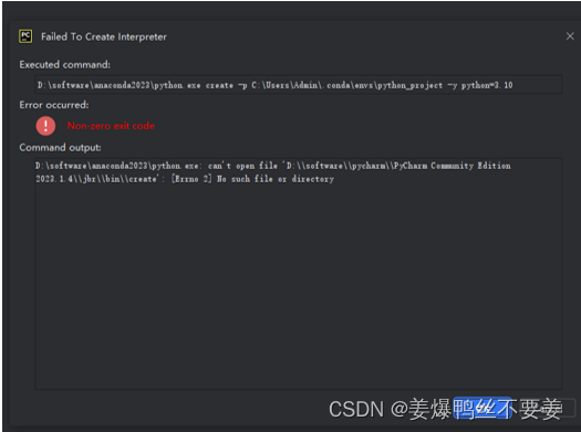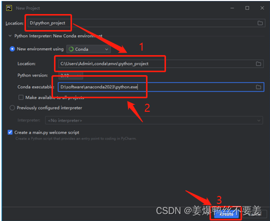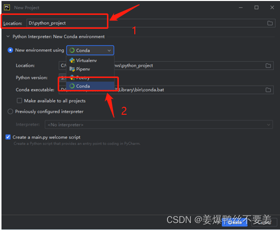 选择conda之后,location的选择与前面一致(我这里忘记设置了),然后在conda executable中,选择anaconda安装路径中的 python.exe,然后点击** create**