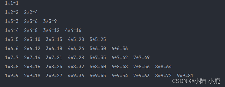 System.out.print(j+"*"+i+"="+i*j+" ");