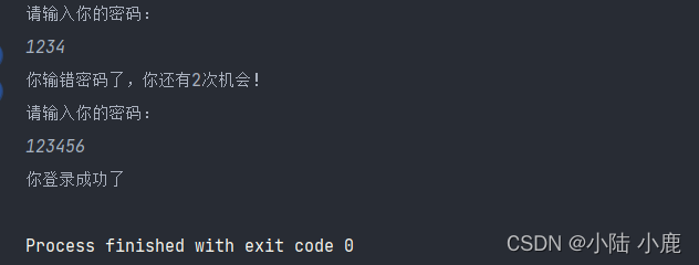8、编写代码模拟三次密码输入的场景。最多输入三次,密码正确提示“成功登录”,密码错误提示“剩余输入次数”