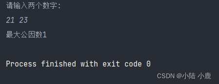 【思路:两个数中的大数对小数取余分为两种情况(①余数不为0用两个数中的小数对余数进行取余知道余数为零时输出②余数为零则两个数中的较小数为最大公因数)】