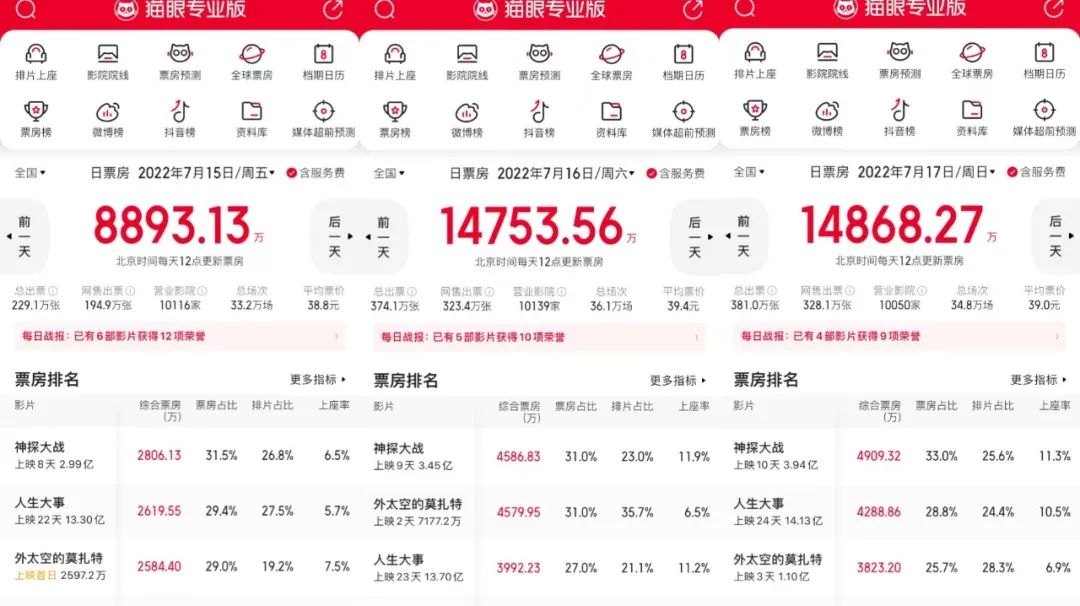 按去年传闻,该片是因后期来不及而延期。到了今年,业内一直盼着这盘“硬菜”能点燃暑期档。然而与预期完全不符,《外太空的莫扎特》自定档以来,热度一直很低,首日预售票房仅为700万。更想不到的是,上映三天连票房日冠都没有拿到,每日票房被上映了一星期的港片《神探大战》压过。