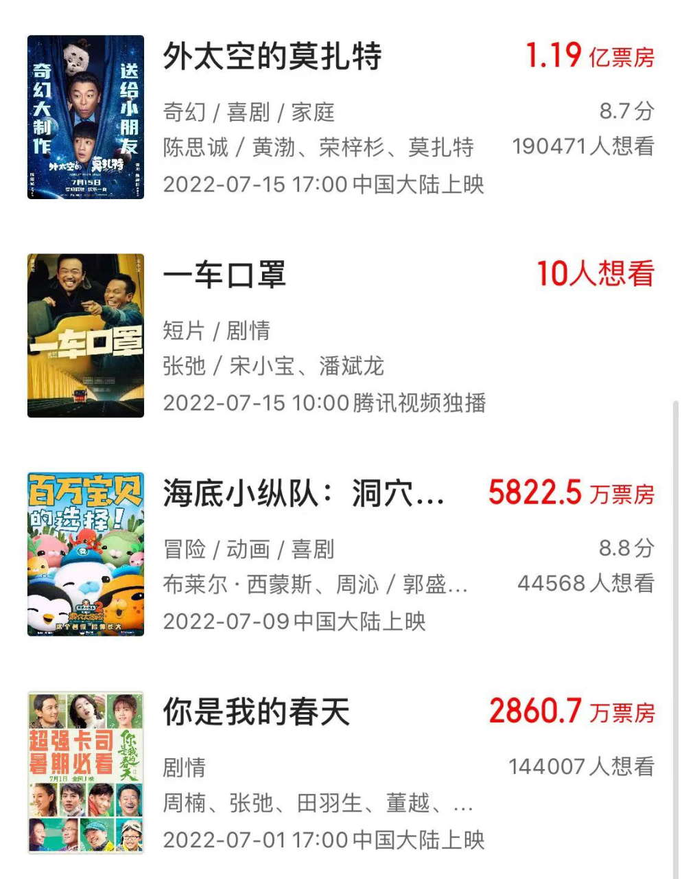 现在连陈思诚这颗摇钱树都不灵了,可想而知“曾茂军们”的确很难向王健林交代。整个上半年,因为疫情反复,万达没有上映一部电影。到7月,一口气上映三部电影,结果票房都扑街了。其中,群星参演的抗疫片《你是我的春天》票房三千万不到,国外导演执导的动画片《海底小纵队》票房只卖了五千多万。