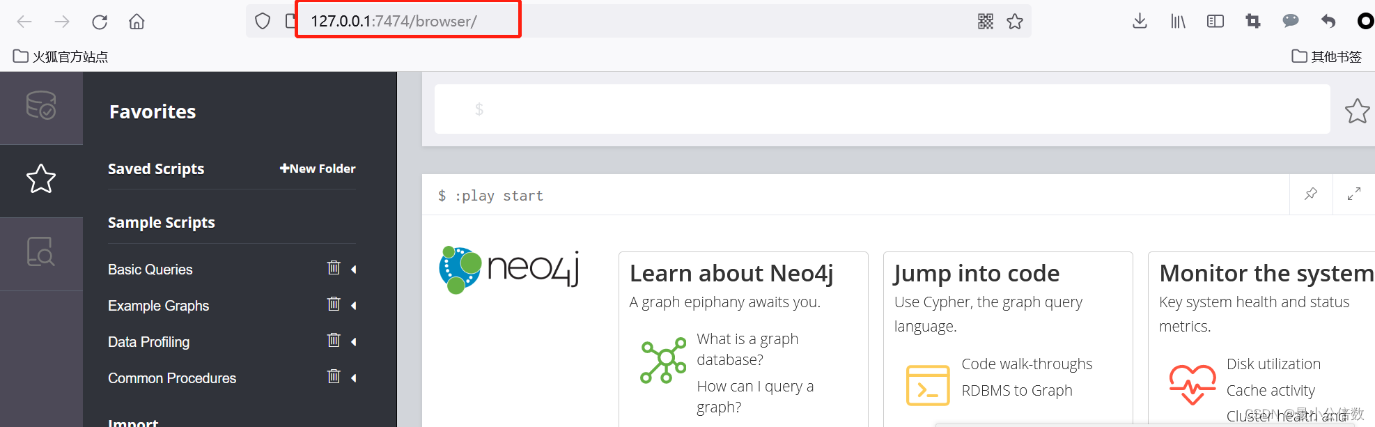 出现上图所示,则表示成功安装,现在可通过浏览器访问:http://localhost:7474/ 进入图数据库系统。【默认登陆密码为:neo4j】