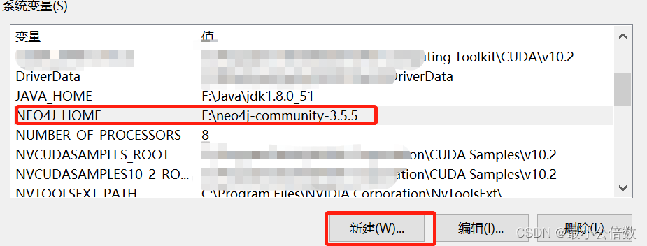 系统变量,新建 NEO4J_HOME 值为 F:\neo4j-community-3.5.5