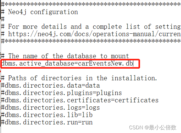 2a) 将下图路径中的配置文件neo4j.conf用记事本打开,修改dbms.active_database=****.db, 其中***表示你需要导入的数据库名称。