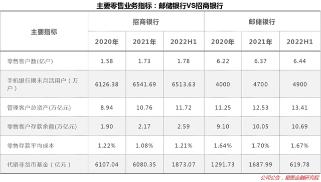 从AUM结构来看,截至2022年6月末,邮储银行管理个人客户资产13.41万亿元,其中存款占比79.7%;同期招商银行管理个人客户资产11.72万亿元,存款占比仅为22%。正因如此,招行可以依赖客户其他类型资产派生存款,存款结构中活期占比高达66%,2022H1零售存款平均成本仅为1.21%,优于邮储银行的1.67%(未还原代理费)。
