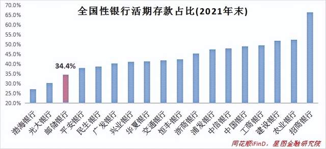 先从现状和问题说起。一般来说,庞大的网点资源对应着较高的活期存款占比。典型如工农中建四大行,活期存款占比均在50%上下,但邮储银行的存款结构却以定期为主,2021年末活期存款占比仅为34.4%(2022H1降至31.71%),在全国性银行中仅高于渤海银行和光大银行。其结果便是其存款成本在考虑代理费后在同业中并无明显优势,甚至相比其他大行略有劣势。