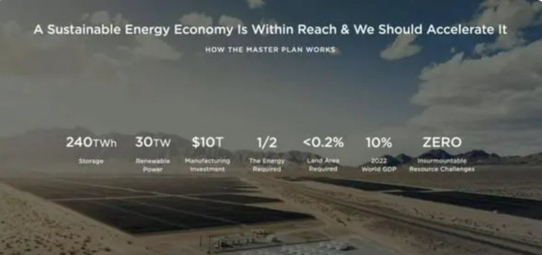 具体到如何实现这一目标,马斯克给出的前提条件是: 储能240TWh、可再生电力30TW、制造投资10万亿美元、需要能源不到燃料经济的一半、占地面积低于0.2%、占2022年全球GDP的10%、无法克服的资源挑战为零。 这么看来,这些条件中的任何一项短期内都几乎无法实现,尤其是10万亿美元的投资构想,更是让投资者无语之至。
