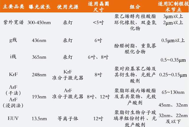 其中,今天的主角也就是半导体光刻胶,按照光源波长的从大到小,可分为紫外宽谱(300-450nm)、g线(436nm)、i线(365nm)、KrF(248nm)、ArF(193nm)、EUV(13.5nm)等主要品类,每一种品类的组分、适用的IC制程技术节点也不尽相同。