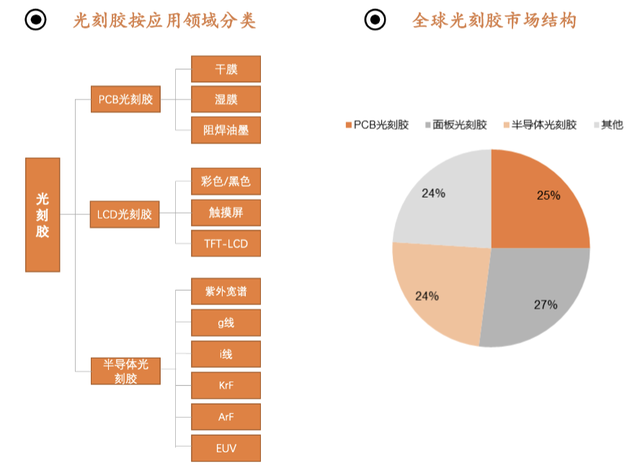 但光刻胶并非只有芯片制造一个应用场景,按照下游应用领域划分,主要有PCB、面板、半导体三类,每一类光刻胶又有各自细分品类。
