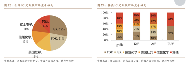 半导体光刻胶市场的前五中除了美国杜邦,其余四家均为日本企业。其中JSR、TOK的产品可以覆盖所有半导体光刻胶品种,是绝对的龙头,尤其在高端EUV市场高度垄断。