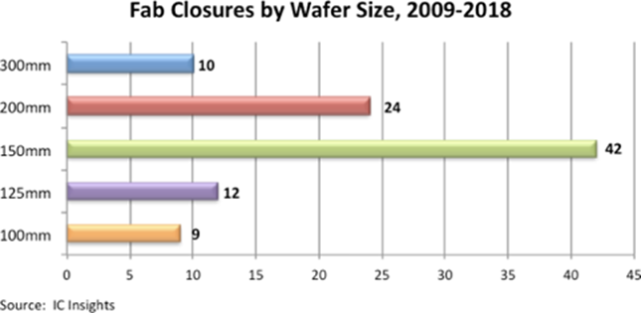 据IC Insights统计,2009-2018年,全球半导体制造商总共关闭或重建了97座晶圆厂。其中,关闭了42座150mm(6英寸)和24座200mm(8英寸)晶圆厂。具体如下图所示。