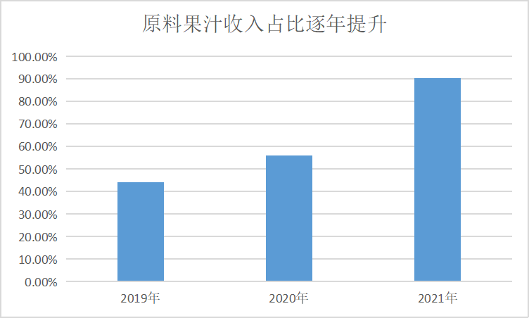 新茶饮品牌盈利压力之下,田野股份所在的新茶饮原料果汁供应链环节,很难说不会被替代。要知道,原料果汁是田野股份最抗打的业务,其营收占比已经从2019年的44.13%提高至2021年的90.52%,一旦不再被需要,将十分致命。