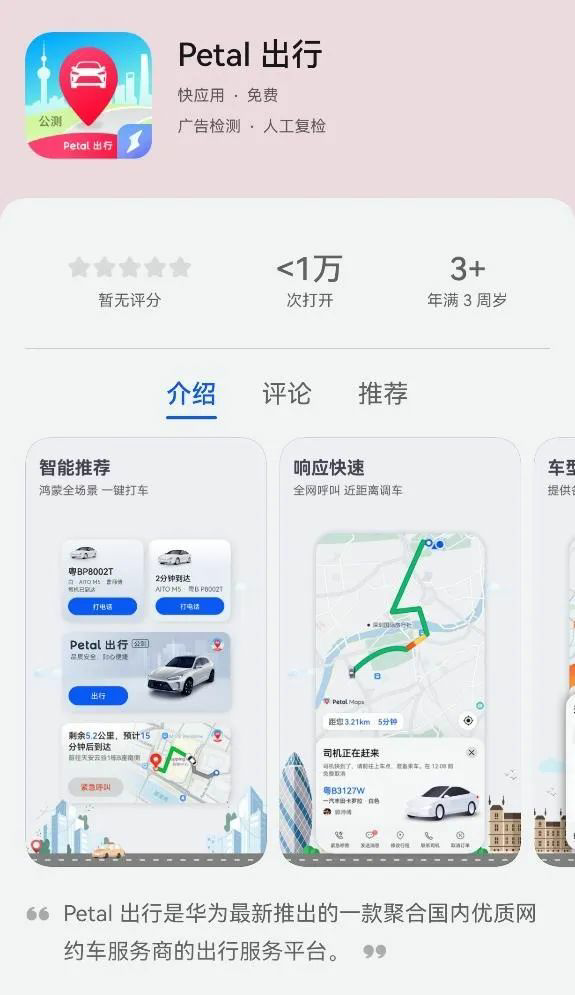 去年7月,据相关媒体报道,华为在其诸多终端上推出了“Petal出行”的打车应用,邀请华为一些用户参与众测。据连线出行获悉,这一应用是基于华为旗下花瓣地图打造,在运营模式上采用了聚合模式。