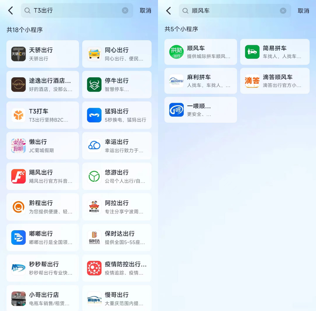 如果以“T3出行”作为关键词搜索,可以看到反馈结果除了T3打车小程序之外,还有十几个以出行为名称的小程序;而以“顺风车”为关键词搜索,也能看到结果包括嘀嗒顺风车、一嗨顺风车等5个出行相关小程序。