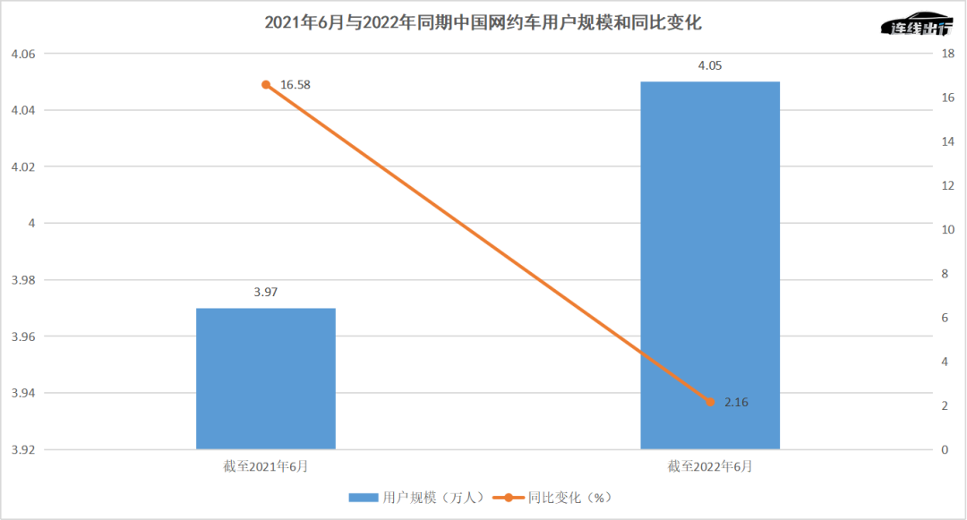 这样的现象同样发生在需求端。按照中国互联网络信息中心发布的数据显示,截至去年6月我国网约车用户规模达4.05万人,虽然同比增长了2.16%。但2021年同期的同比增幅则高达16.58%。