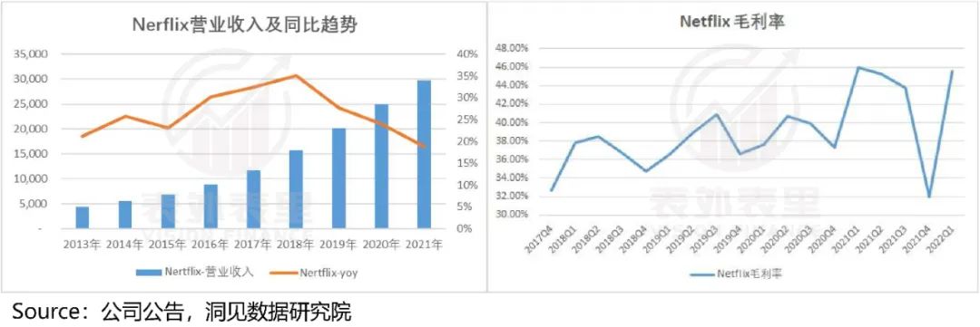Netflix手握《纸牌屋》《女子监狱》等一系列高端自制剧,介入内容制作扭转行业地位的同时,毛利率和营收也随着会员数规模的扩大而保持长期增长。