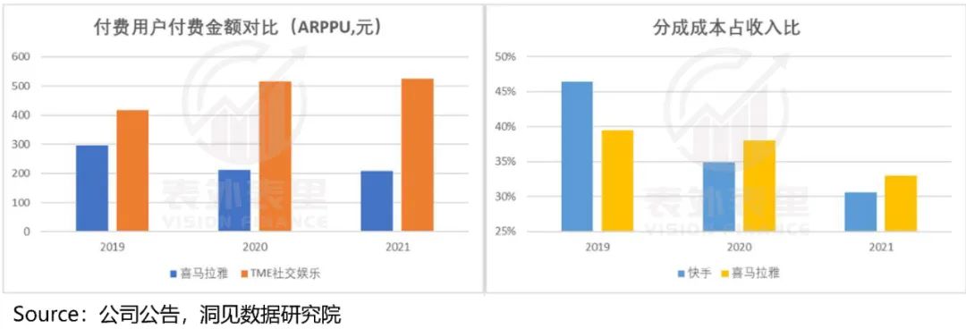 而成本控制的表现却相反,喜马拉雅分成成本占收比降低的幅度一直比较小,相比之下,快手的分成成本占收入比,在快速降低。