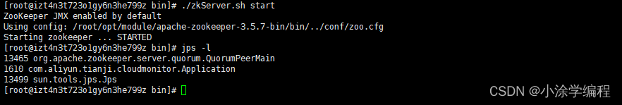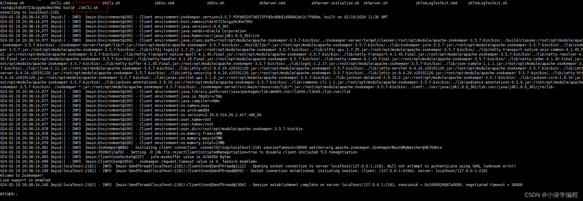在/root/opt/module/apache-zookeeper-3.5.7-bin/bin 目录下执行
