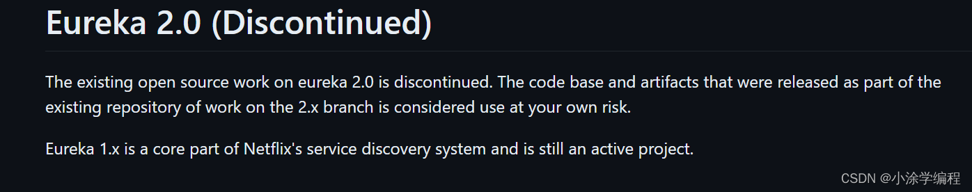 现有的关于eureka2.0的开源工作已经停止。作为2.x分支上现有工作存储库的一部分发布的代码库和工件被视为使用风险自负。