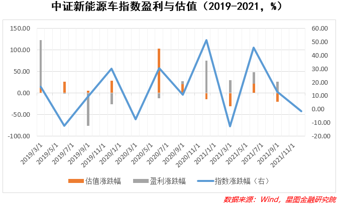 以中证新能源车指数(399976)作为参考标的,新能源车指数的行情在2019年初至2021年末基本呈现出了单边上涨的走势,所以我们暂且将其看作是近五年新能源车第一波上升行情,并将其拆分为盈利驱动和估值驱动两个维度。