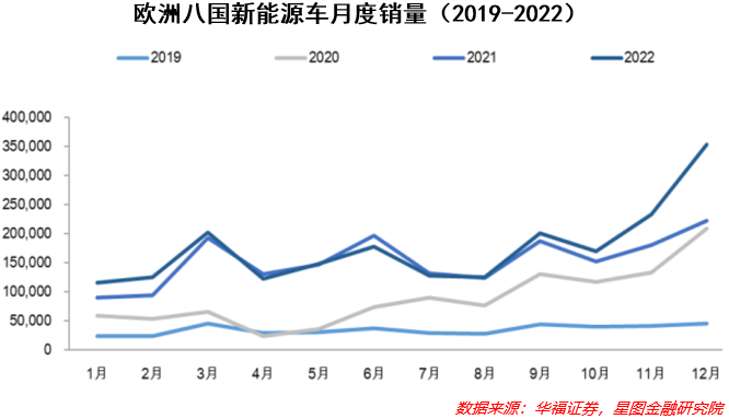 而在欧洲市场方面,欧洲八国(英国、法国、瑞典、挪威、意大利、西班牙、芬兰、葡萄牙)新能源车销量在供给受限的情况缓解后,在2022年下半年逐渐放量,而从2023年全年的市场情况看,通胀压力下行将一定刺激汽车的消费。