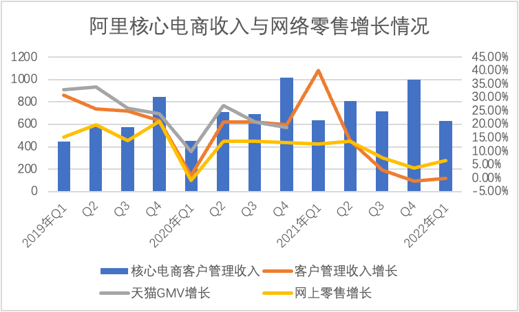 在上图中我们可以比较清晰看到,2021年下半年开始阿里核心电商客户管理收入增长就进入低谷,甚至在2021年Q4出现了负增长,2022年Q1,天猫和淘宝GMV出现小幅下行,客户管理收入维持与上年同期持平。