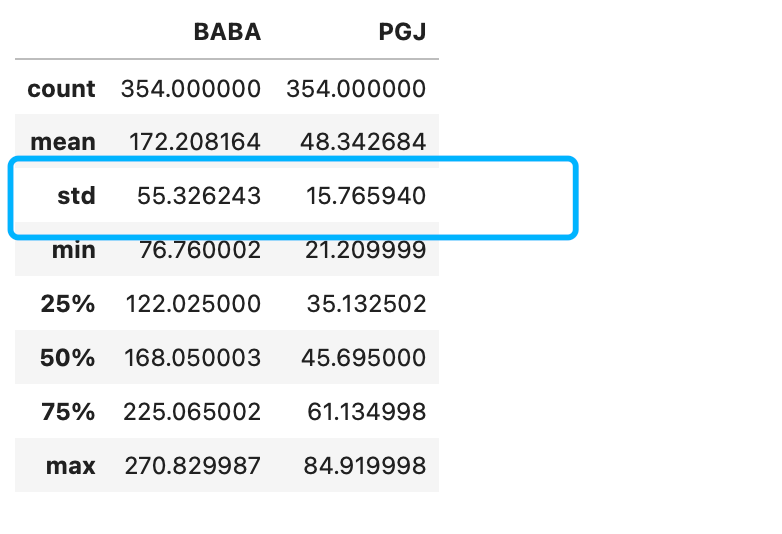 在上图中,阿里的股价的标准差远大于金龙指数,也可在此验证我们的判断,作为一个一支稳定收益基金,其首先要做的是分散风险,即降低对高波动性股票的持有量,增加低波动性股票的仓位。