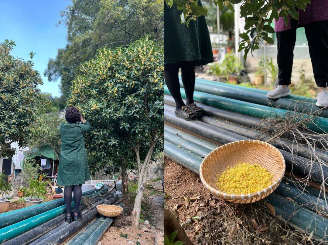 见到吴阿姨那天,她正站在自家院子门口的桂花树下摘花,不一会儿竹筛子里就铺上了厚厚的一层。她抖了抖掉落在身上的桂花说:“衣服上不要沾到桂花,桂花渍难洗。”