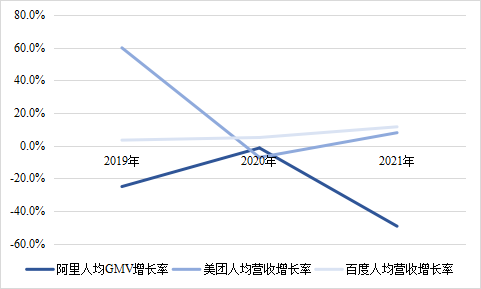 2019-2021年阿里、美团、百度人效增长率变化