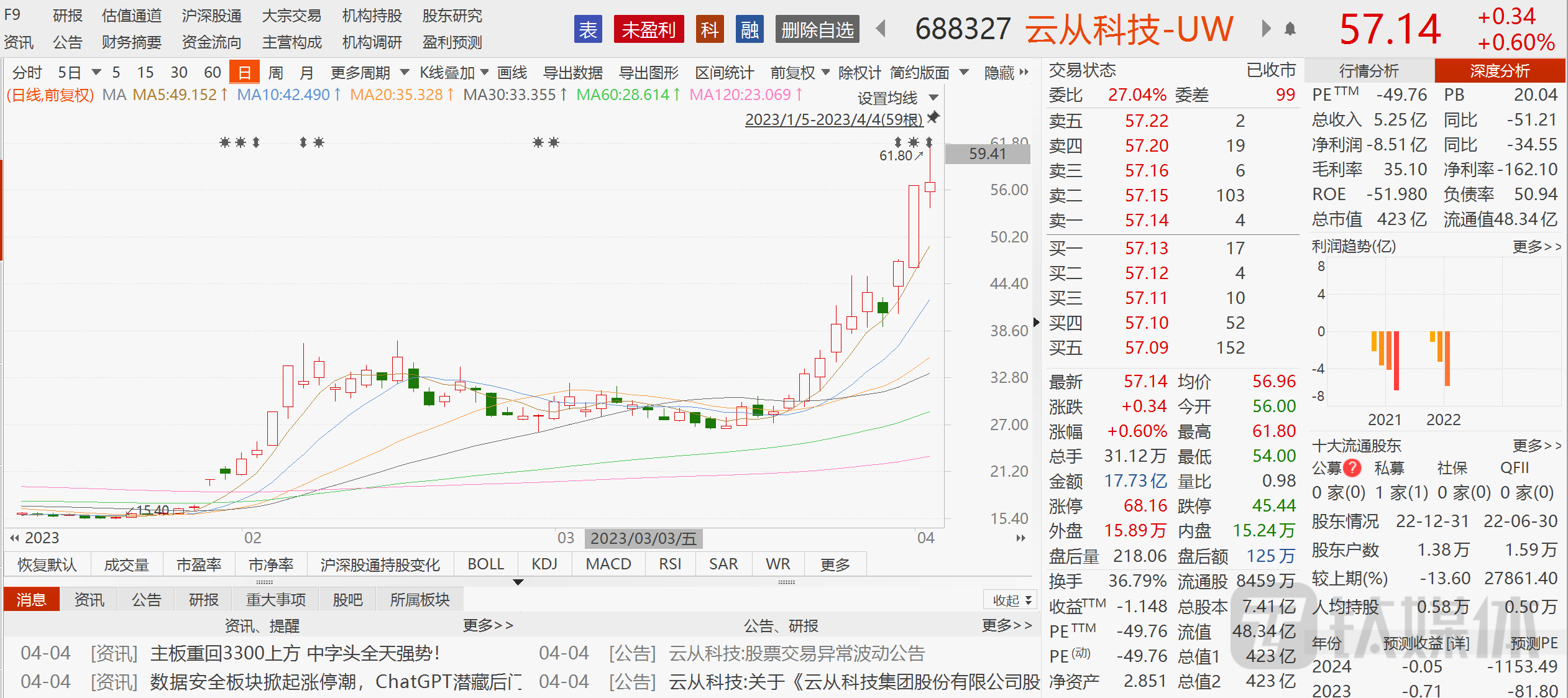 然而公司这份自我“降温”公告,并没能挡住二级市场对其投资的热情。4月4日,云从科技盘中下跌超4%,随后震荡反弹超8%,收涨0.6%,截至收盘报收57.14元,总市值423亿元。