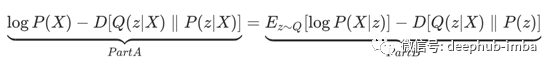 对于A部分:就是在等式左边的这一项,它对于反向传播来说并不是一个有利的设定(我们并不知道P(X)的表达式是多少),但是我们可以知道如果想要在给定z的情况下最大化log(P(X)),可以通过最小化减号右边的部分来实现(这样可以使得Q(z|x)的分布尽可能接近P(z|X)的分布),这也正是我们在一开始时提到的最终目标。