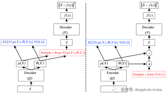 VAE的详细架构。左边的图和右边的图是类似的,只是左边示例中展示了反向传播,实际使用图一般为右边的示例
