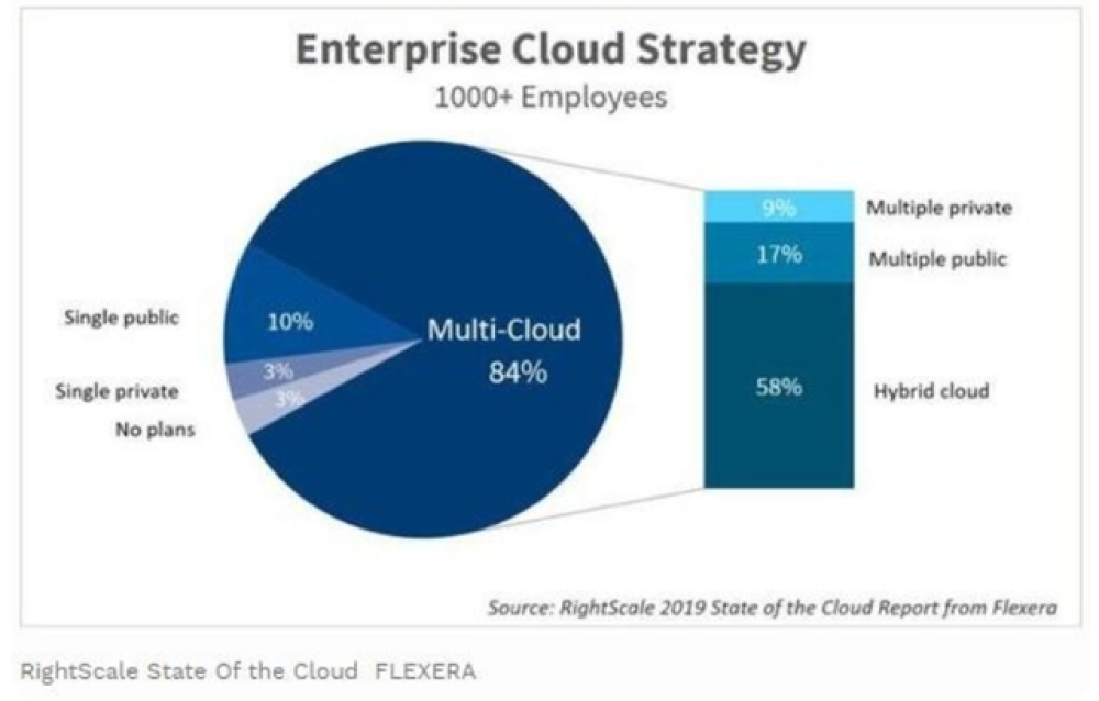 根据RightScale2019年全球企业用云策略调查结果,对于拥有超过1000名雇员的大型企业,有84%的用户会选择多云部署,而在选择多云部署的企业中,有58%的用户会选择混合云,17%的用户选多种公有云部署。