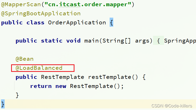 在order-service的OrderApplication中,给RestTemplate这个Bean添加一个@LoadBalanced注解: