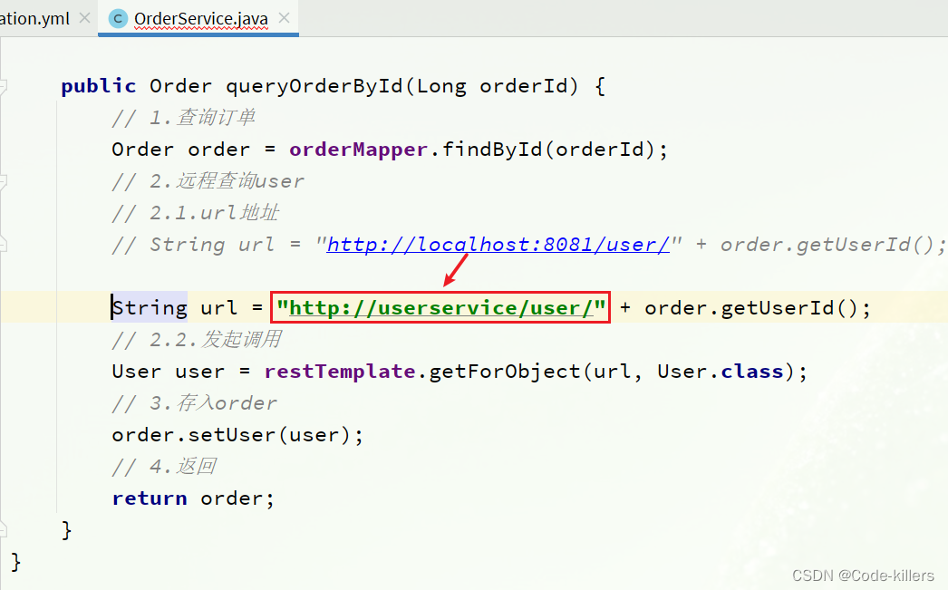 修改order-service服务中的cn.itcast.order.service包下的OrderService类中的queryOrderById方法。修改访问的url路径,用服务名代替ip、端口: